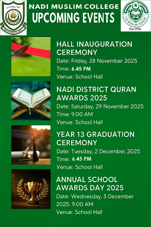 Nadi Muslim College is proud to announce a series of important school events taking place over the coming days. We warmly invite students, parents, guardians, and community members to join us as we celebrate milestones, achievements, and the spirit of learning.